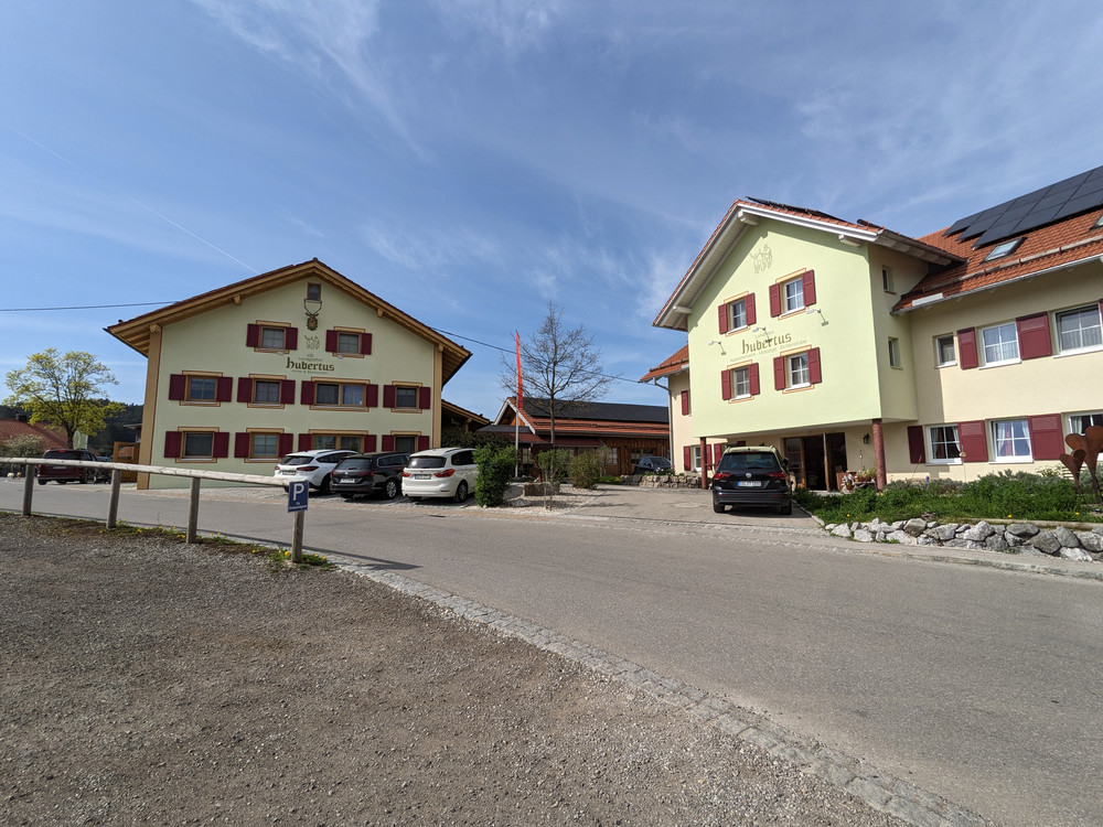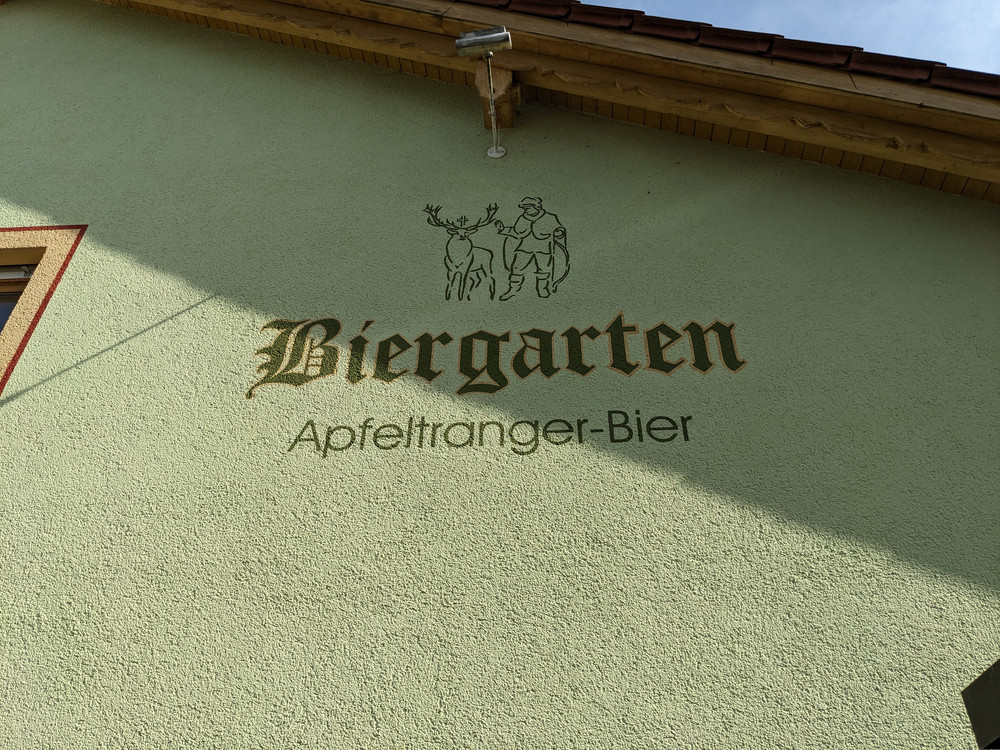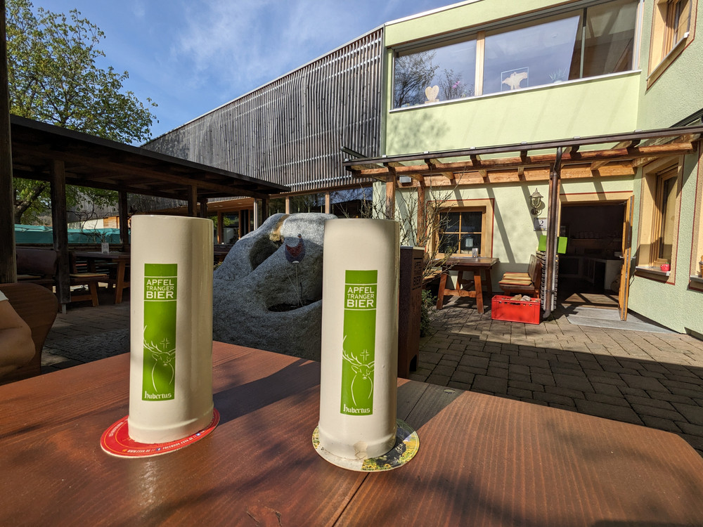 Bevor es zum Bier kam, arbeiteten wir uns über den Dampflokweg eine ordentliche Portion Durst an. Beim „Hubertus in Apfeltrang war der Biergarten noch komplett leer. Schnell wurde die erste halbe selbstgebrautes Bier serviert. Im kühlen Steinkrug gab es nur einen kurzen Zisch, da war es auch schon weg.