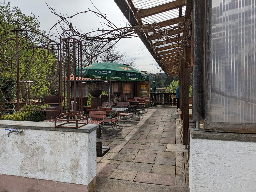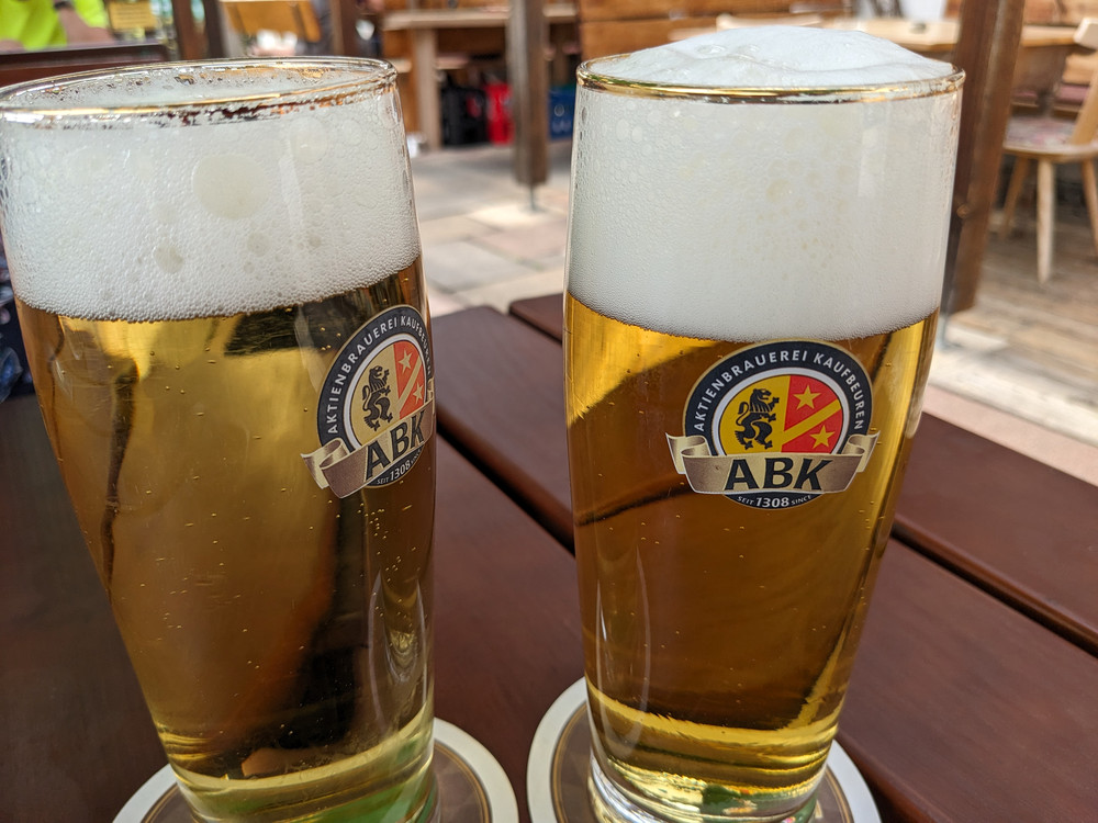 Beim Hack kann man schick draußen sitzen, wahlweise hinten im Garten oder vorne zur Straße hin. Autos kommen nur unregelmäßig vorbei. Als Bier wurde feines ABK (Aktienbrauerei Kaufbeuren) serviert, was zwar Lust auf das zweite machte. Aus Zeitgründen mussten wir aber darauf verzichten, genauso wie auf die Halbe bei der Mooshütte.