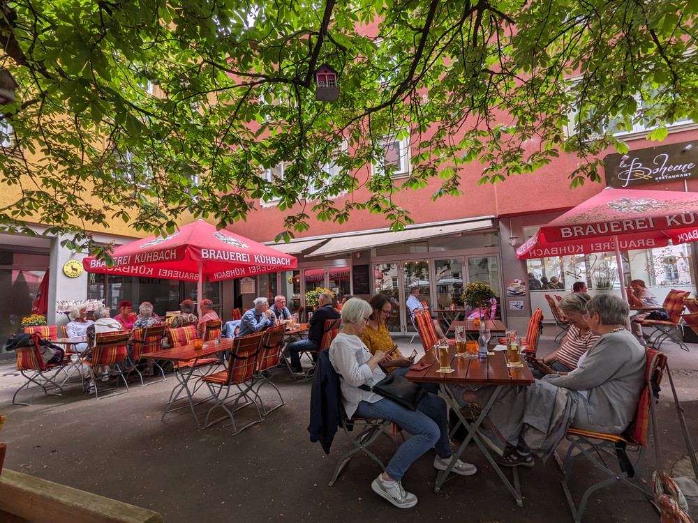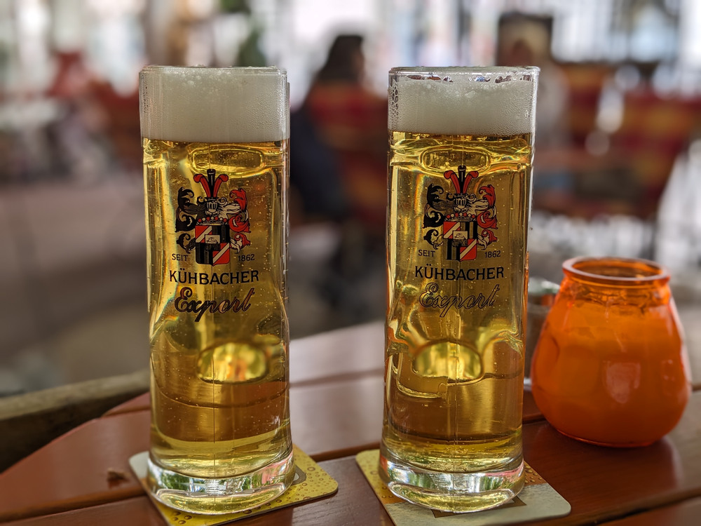 Serviert wird Kühbacher Bier. Dieses Mal passte das Wetter, sodass wir im Biergarten einkehrten. Wir kamen gerade von der Hauptversammlung der Lechwerke AG. Dort gab es nur alkoholfreies Bier.