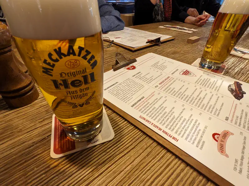 Die Location ist wirklich schick, viel Holz, viel Auto, viel Schnickschnack. So sind die Griffe an den Türen alte Zapfhähne. Das Bier wurde schnell geliefert, es gab Meckatzer und auch das Essen wurde schnell geliefert. Lecker wars auch, hier gibt es erstmal nichts zu meckern. Das ganze am schicken langen Tisch mit bequemen Barhockern.