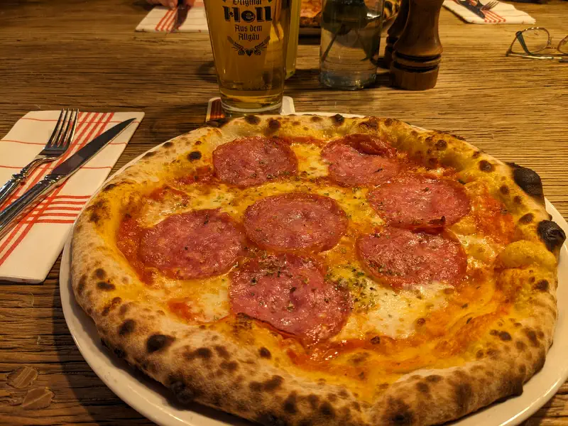 Preislich muss man sagen, schon ambitioniert. Münschen eben. Salamipizza noch halbwegs günstig für 17 Euro. Burger um die 25 Euro, auch der Rest nicht unbedingt preiswert. Bier 6 Euro, inzwischen der Rahmen für München.